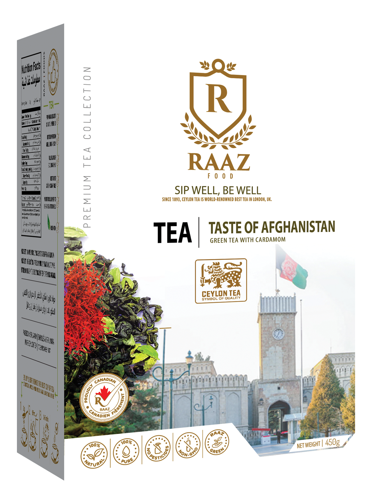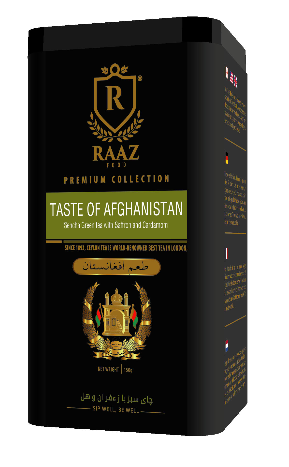 Raaz Premium Tea Collection offers a fine blend of 100% natural Ceylon Tea, free of pesticides. Carefully picked from lush green hill of center mountains in Sri Lanka. Raaz black tea fused with natural cinnamon, cardamom and saffron combines a special blend of Persian flavoures. A perfectly brewed, nutrient-rich cup of Raaz Taste of Persia,infused with appetizing spicy-aroma, restores your energy and revives your senses.